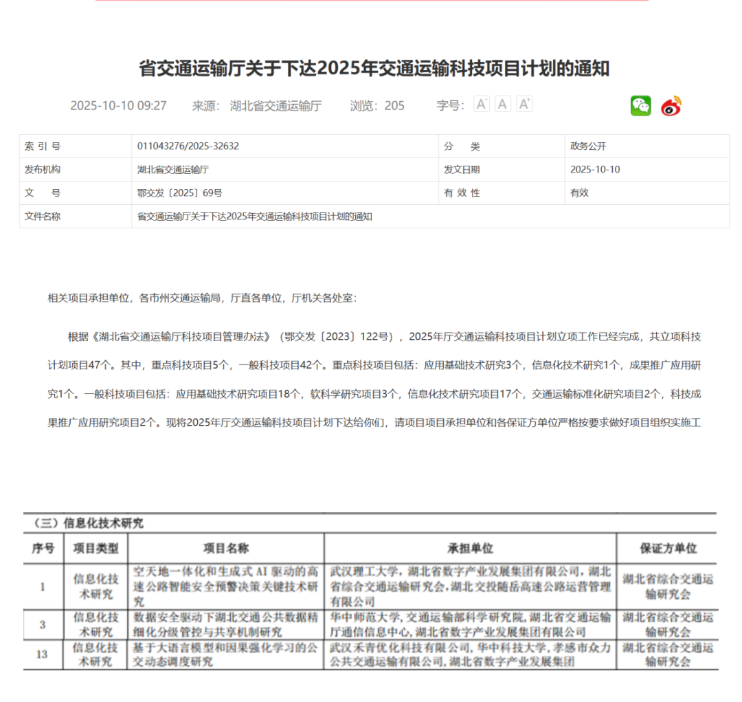 湖北聯(lián)投數(shù)產(chǎn)集團(tuán)三項(xiàng)課題入選湖北省交通廳2025年科技項(xiàng)目立項(xiàng)計(jì)劃