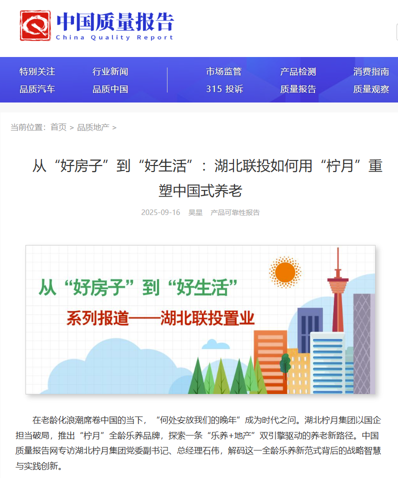 2025年,“好房子”首次被寫入政府工作報(bào)道,銀發(fā)經(jīng)濟(jì)成為戰(zhàn)略發(fā)展重點(diǎn)。作為“城市更新全齡樂養(yǎng)生活營(yíng)造商”,湖北檸月集團(tuán)始終立足“好房子+好服務(wù)”,著力打造兼具適老居住功能與多元樂養(yǎng)體驗(yàn)的全齡樂養(yǎng)新生態(tài)。近日,中國(guó)質(zhì)量報(bào)告網(wǎng)官方報(bào)道《從“好房子”到“好生活”:湖北聯(lián)投如何用“檸月”重塑中國(guó)式養(yǎng)老》,講述湖北檸月集團(tuán)如何加速轉(zhuǎn)型,通過“樂養(yǎng)+地產(chǎn)”的雙引擎驅(qū)動(dòng)模式,創(chuàng)新打造 “檸月” 全齡樂養(yǎng)品牌,為中國(guó)現(xiàn)代化養(yǎng)老提供新范式,助推銀發(fā)經(jīng)濟(jì)高質(zhì)量發(fā)展。以下為報(bào)道轉(zhuǎn)載原文: