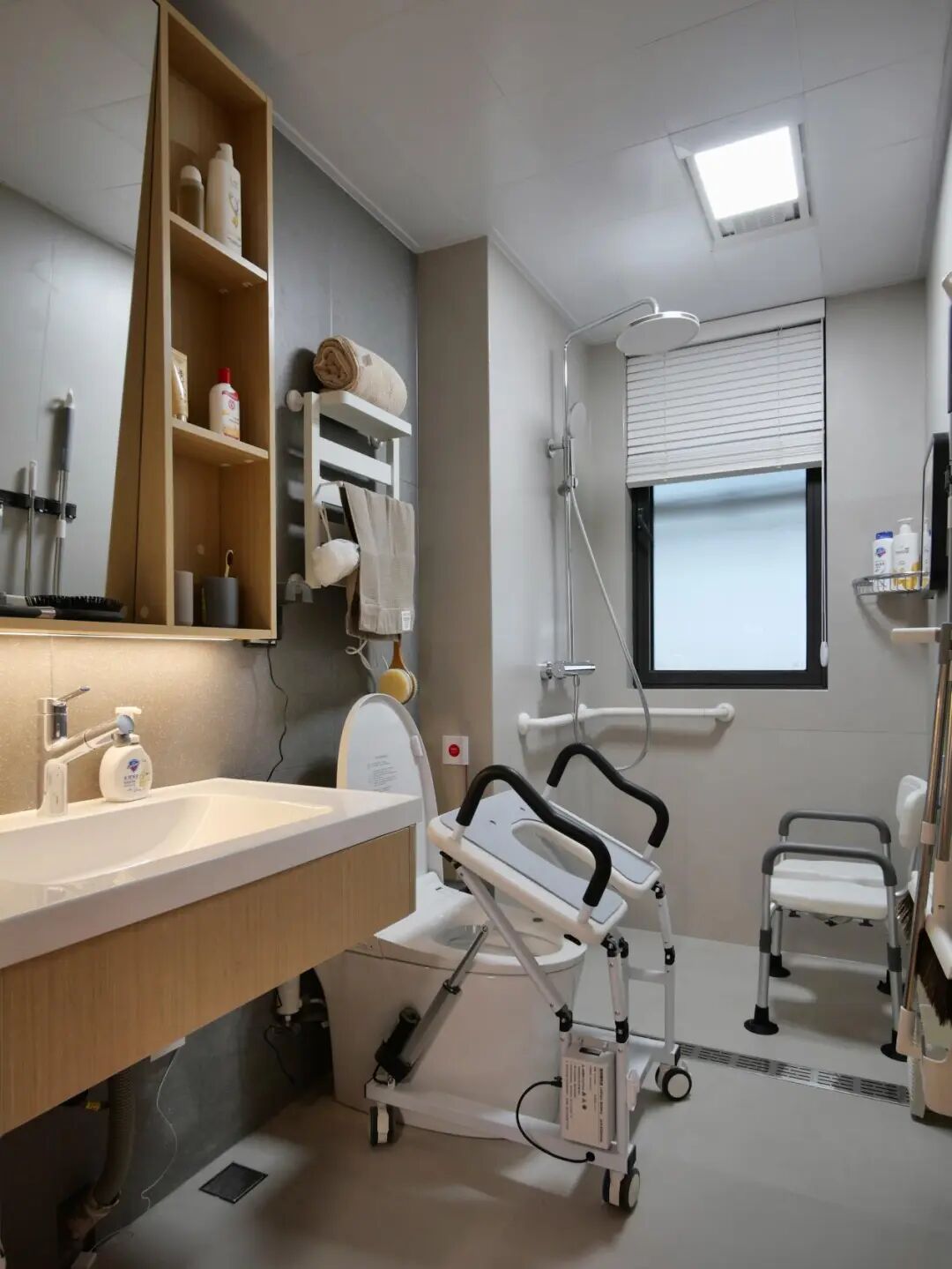衛(wèi)生間:L型扶手、淋浴凳與輪椅回轉(zhuǎn)空間形成“安全三角”。