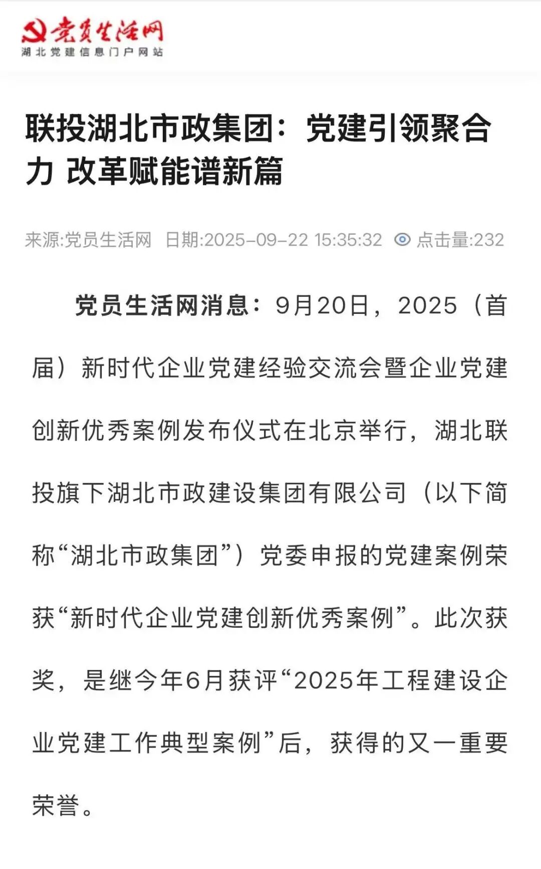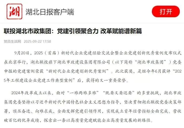 9月20日,2025(首屆)新時(shí)代企業(yè)黨建經(jīng)驗(yàn)交流會(huì)暨企業(yè)黨建創(chuàng)新優(yōu)秀案例發(fā)布儀式在北京舉行,湖北聯(lián)投旗下湖北市政建設(shè)集團(tuán)有限公司(以下簡(jiǎn)稱“湖北市政集團(tuán)”)黨委申報(bào)的黨建案例榮獲“新時(shí)代企業(yè)黨建創(chuàng)新優(yōu)秀案例”。此次獲獎(jiǎng),是繼今年6月獲評(píng)“2025年工程建設(shè)企業(yè)黨建工作典型案例”后,獲得的又一重要榮譽(yù)。
