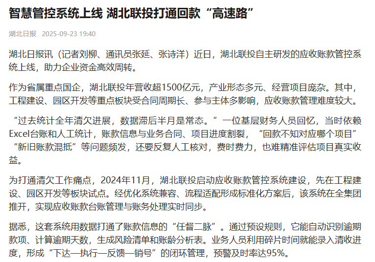 為打通清欠工作痛點,2024年11月,湖北聯(lián)投啟動應收賬款管控系統(tǒng)建設,先在工程建設、園區(qū)開發(fā)等板塊試點。經(jīng)優(yōu)化系統(tǒng)兼容、流程適配形成標準化方案后,該系統(tǒng)在全集團推開,實現(xiàn)應收賬款臺賬管理與賬務處理實時同步。